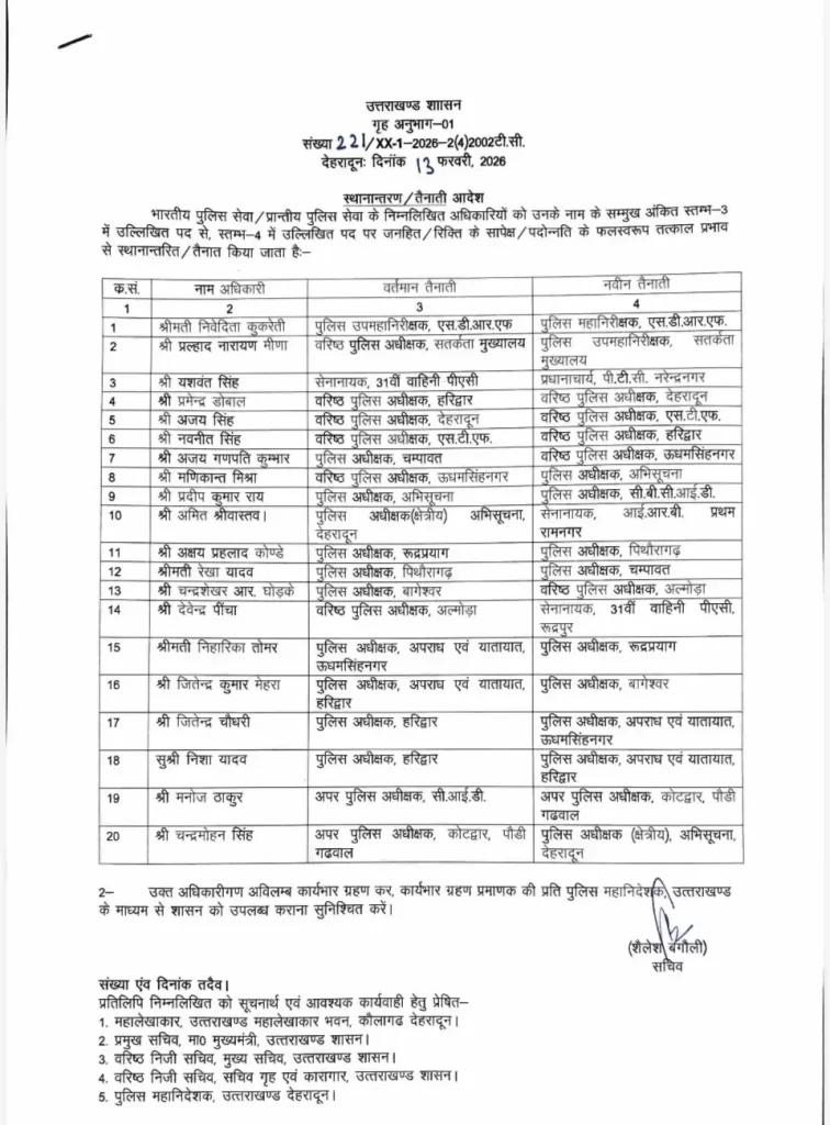 देहरादून,शासन ने शुक्रवार को देहरादून,हरिद्वार,ऊधमसिंह नगर समेत 8 जिलो के पुलिस कप्तान बदल दिए हैं,पुलिस मुख्यालय के कुछ आला अधिकारियों के साथ ही 20 आईपीएस और पीपीएस अफसरों की जिम्मेदारी में फेरबदल किया गया है।