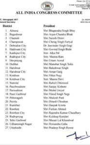 केंद्रीय नेतृत्व ने लम्बे समय से प्रतीक्षित उत्तराखंड कांग्रेस, जिला और शहर कांग्रेस के अध्यक्षों की सूची जारी कर दी है। प्रदेश कांग्रेस मीडिया चेयरमैन राजीव महर्षि ने बताया कि गणेश गोदियाल को उत्तराखंड प्रदेश कांग्रेस का अध्यक्ष बनाया गया है। प्रीतम सिंह को चुनाव अभियान समिति का अध्यक्ष और चुनाव प्रबन्धन समिति का अध्यक्ष हरक सिंह रावत को बनाया गया है। करण माहरा को कांग्रेस कार्य समिति का विशेष आमंत्रित सदस्य बनाया गया है। साथ ही जिला और शहर कांग्रेस के अध्यक्षों की सूची भी जारी कर दी गई है। महर्षि ने बताया की मनोज यादव को प्रदेश कांग्रेस का सह प्रभारी बनाया गया है।